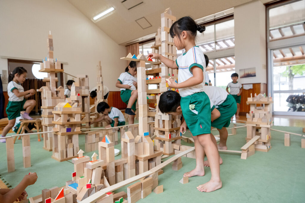 積み木は、「WAKUブロック」を使っています。樺の木でできていて、木の温もりが感じられます。沢山の積み木を使って、迷路を作ったり、中に入って遊べるほどの大きなお家を、みんなで協力してイメージを膨らませながら集中して制作します。